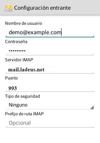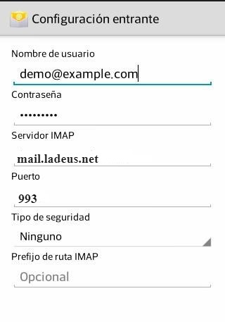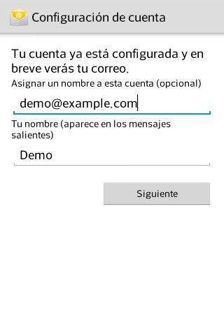 Utilizamos como ejemplo la cuenta “demo@example.com”, esta dirección se debe modificar por el nombre de la cuenta de correo a configurar.