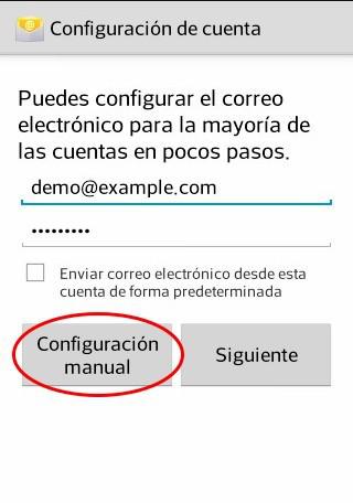 Para configurar una cuenta de correo electrónico en un dispositivo Android, pulsamos sobre el icono "Email" y aparece la pantalla que muestra la siguiente imagen. Una vez indicada la dirección y la contraseña de nuestra cuenta de correo, pulsamos en "Configuración manual".