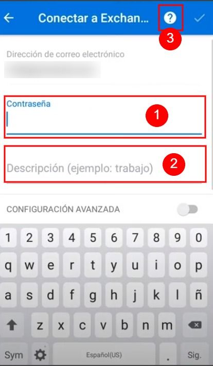 En la pantalla «Configurar a Exchange», escribir la contraseña, añadir descripción (opcional) y hacer click en el símbolo de interrogación.