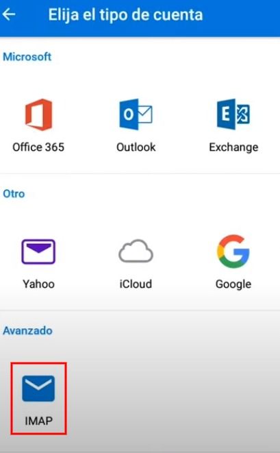 En la pantalla «Elija el tipo de cuenta», hacer click en la opción «IMAP».