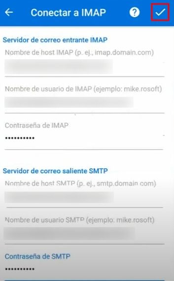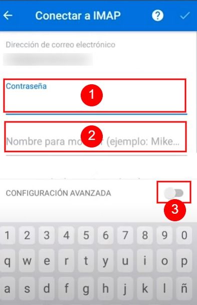 En la pantalla «Conectar a IMAP», volver a escribir la contraseña, asignar el nombre que se mostrará en los mensajes, y hacer click en «Configuración avanzada».