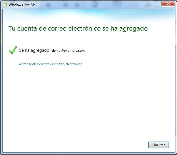 Nos aparece una ventana para informarnos que la cuenta de correo electrónico se ha agregado. Pulsamos sobre el botón "Finalizar" para terminar de configurar la cuenta de correo.