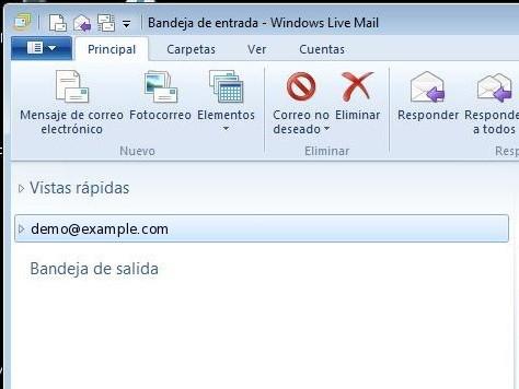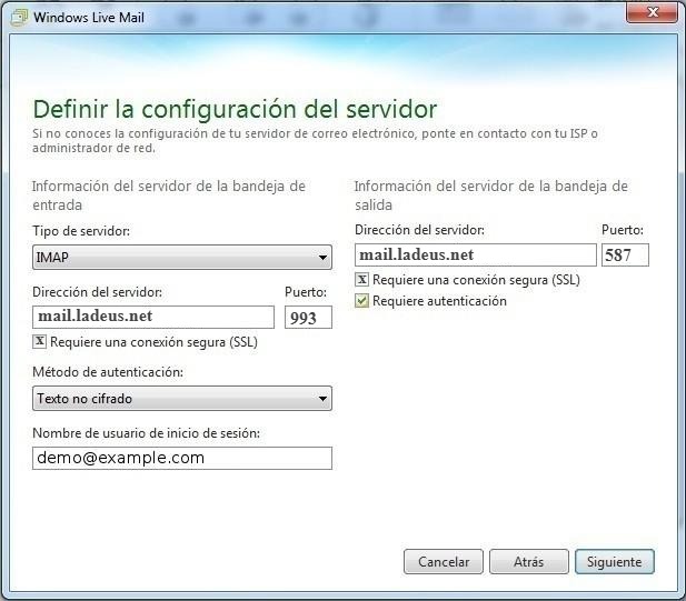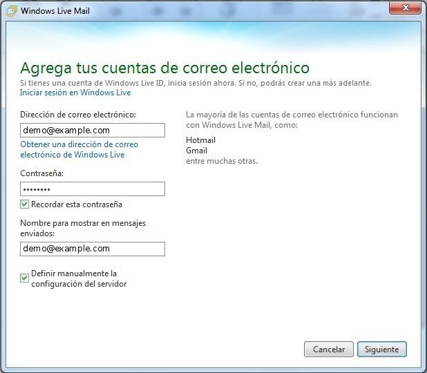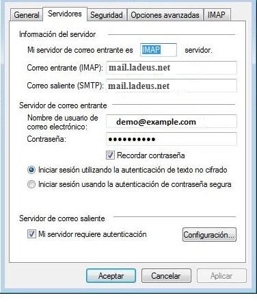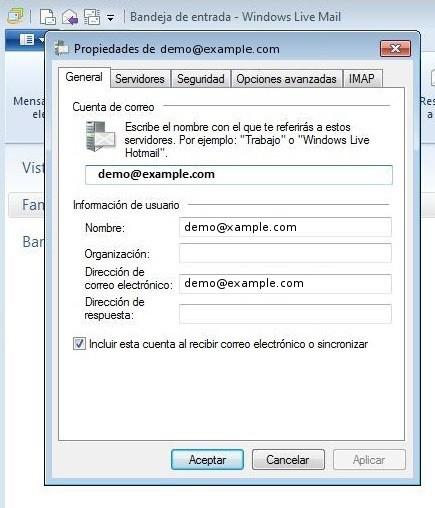 En este caso, utilizamos como ejemplo la cuenta “demo@example.com”, esta dirección se debe modificar por el nombre de la cuenta de correo a configurar.