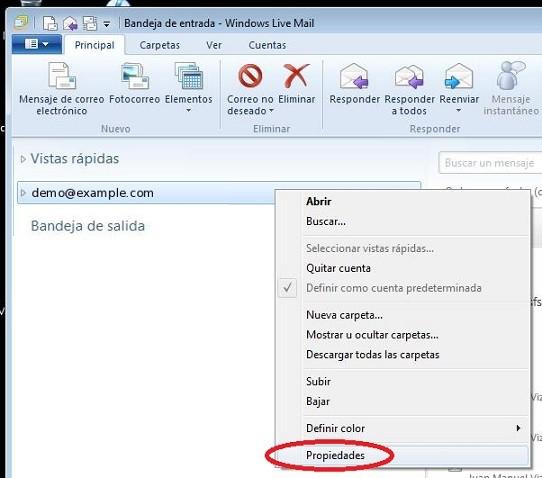 Para acceder a los datos de la cuenta de correo que queremos modificar, situamos el cursor sobre la misma y pulsamos el botón derecho de nuestro ratón. Aparece un menú y pulsamos en "Propiedades".