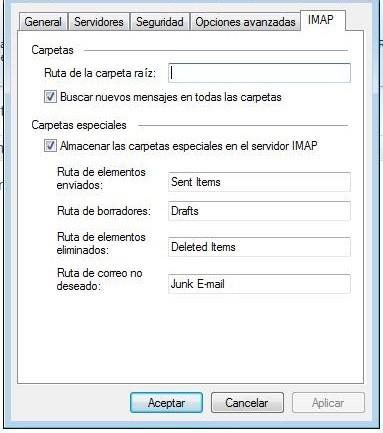 Y por último la pestaña IMAP, en la que podemos configurar los datos correspondientes a Carpetas y Carpetas especiales.