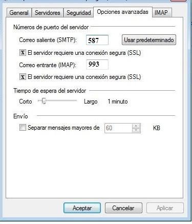 En la pestaña Opciones avanzadas se puede modificar el número de puerto del servidor para correo saliente y para correo entrante; activar las funciones de requerimiento de conexión segura (SSL) y activar la opción que separa los mensajes con mayor peso.