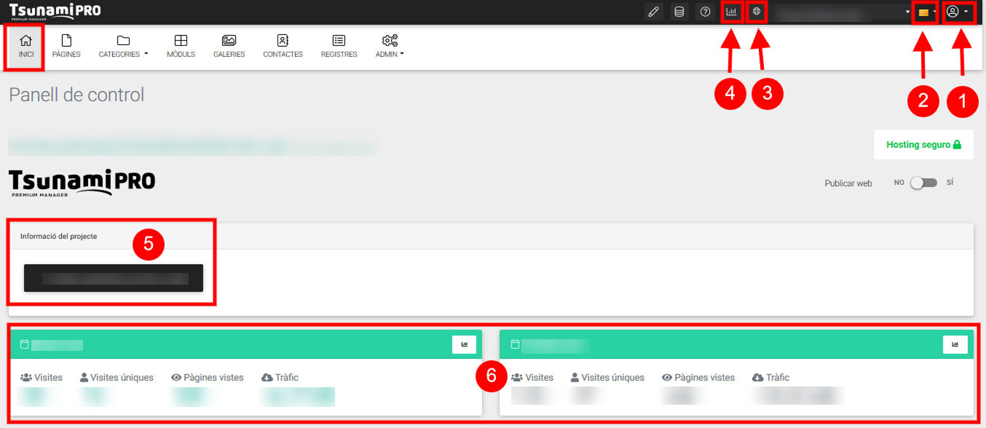En la parte superior de la pantalla encontramos los acesos para desloguearnos de la plataforma y editar nuestro usuario (1), escoger idioma (2), acceder a nuestra web (3) y visitar la página de analítica web (4).