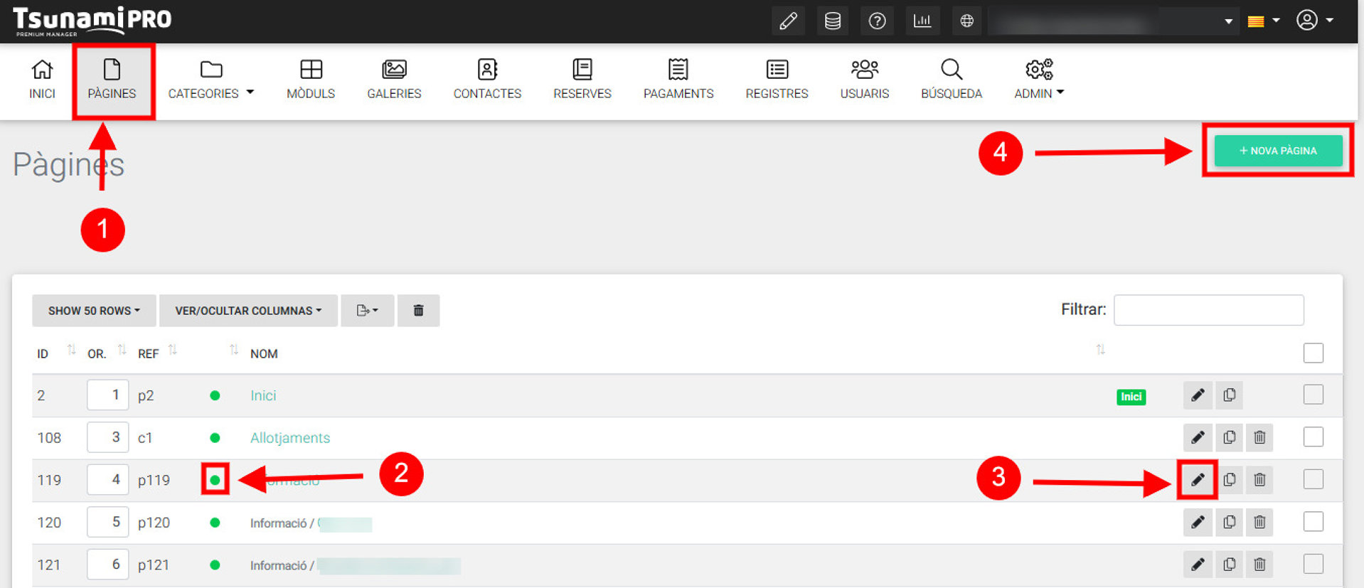Dentro de "Páginas" podemos consultar todo el listado de páginas de la web, activarlas o desactivarlas (2), editarlas (3) o crear una página nueva (4).