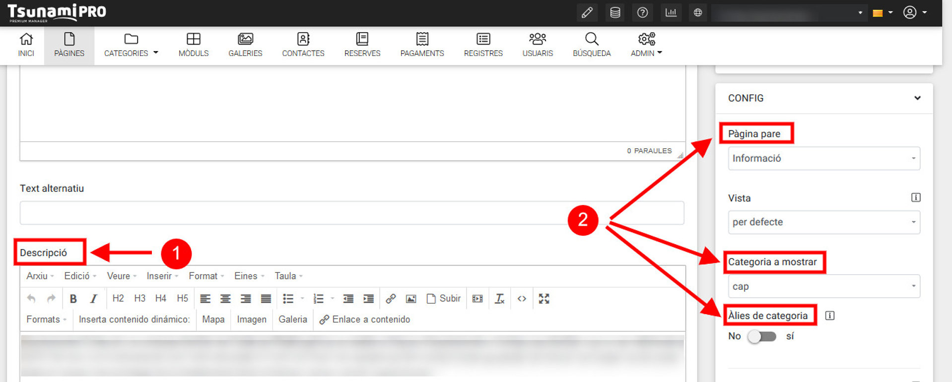 El apartado "Descripción" (1) es donde introducimos o editamos los textos de la página.