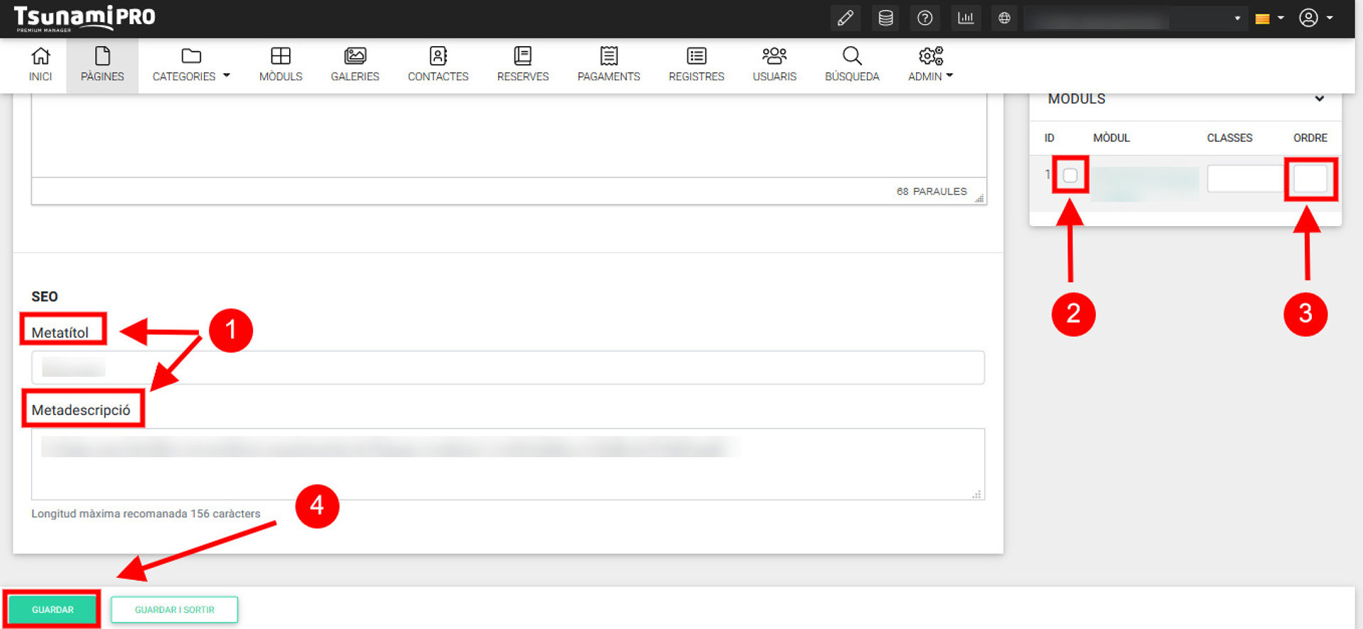 En la parte inferior de la columna derecha hay el apartado "Módulos". En caso que la página utilice módulos, podemos activarlos/desactivarlos (2) y ordenarlos (3) en este apartado.