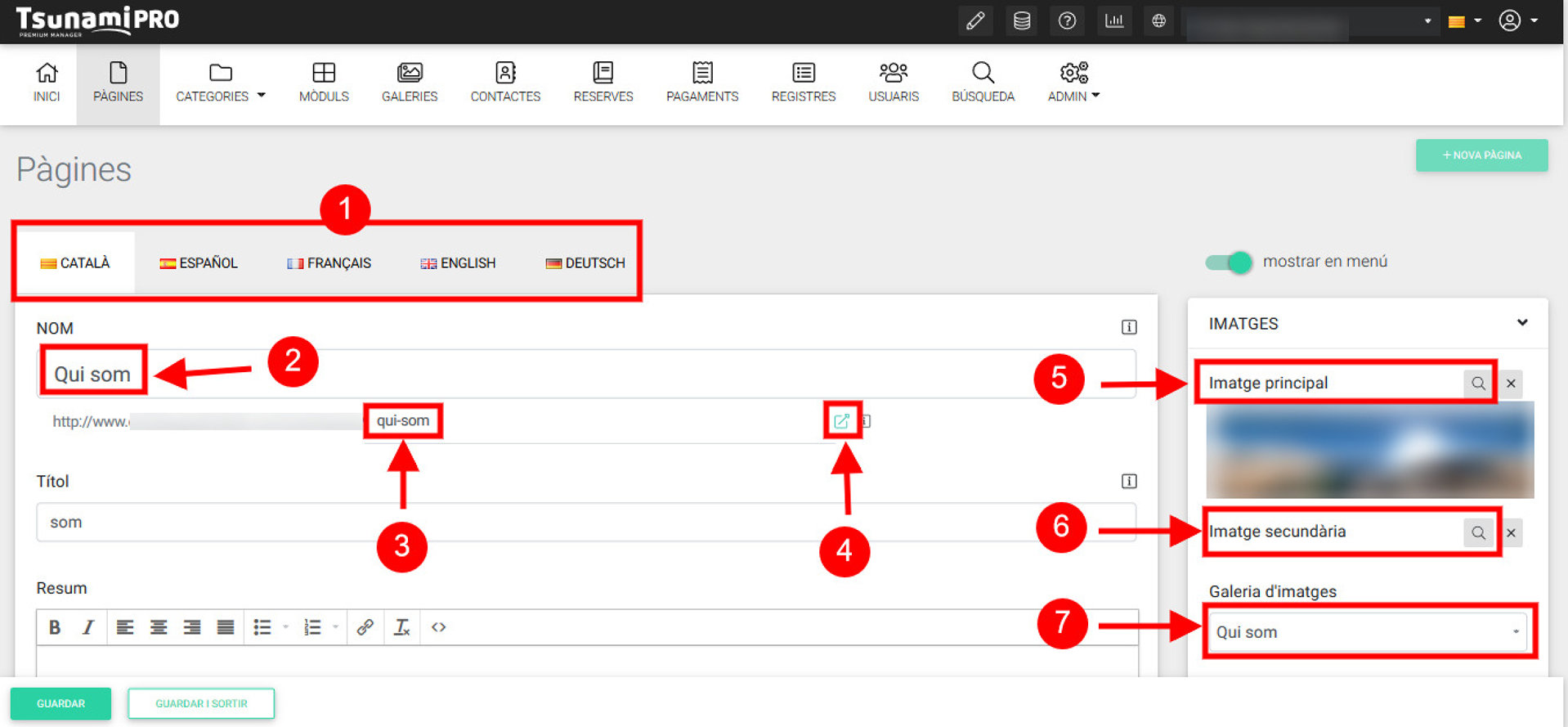 En la columna de la derecha podemos configurar la imagen principal (5), la imagen secundaria (6) (si hace falta) y la galería de imágenes (7) que complementa el contenido (si hace falta).
