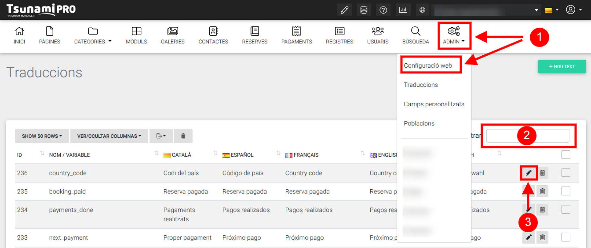 Para acceder a este apartado debemos hacer clic en Config y escoger "Traducciones" en el desplegable (1).